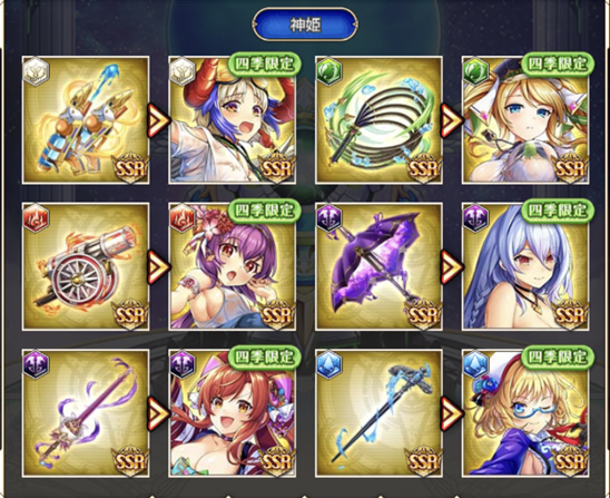 また、毎年7月に 実装から3年経過した神姫は恒常扱いになりプレミアムガチャなどに追加されます。
